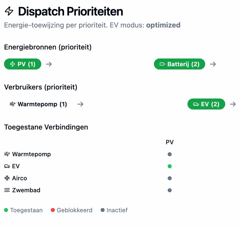 Maximaal eigen verbruik van zonnepanelen, batterij slim laden/ontladen en curtailment minimaliseren.